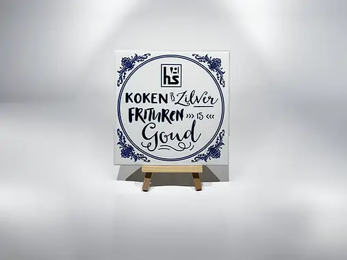 Onze stijlvolle Delfts Blauwe tegels worden met een geprint met een sublimatieprinter en vervolgens met warmte op de tegels aangebracht. Hierdoor zijn het geen stickers maar zit de tekst echt diep in de tegel verwerkt. Sommige modellen die je online vindt zijn bestickert en kan je er dus afkrabben of na verloop van tijd verkleuren/slijten.