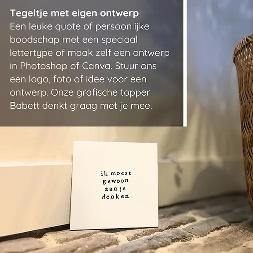 Wij verkopen geen tegels voor je bedrijfsvloer of stoeptegels voor de ingang van je bedrijf. Wij verkopen leuke tegels met opdruk, nou.. eigenlijk bakken we het gewenst ontwerp in de tegel (sublimeren). Hierdoor is de kwaliteit hoog en kan je het ontwerp er nooit afkrabben bijvoorbeeld. Je kan denken aan jullie bedrijfslogo op een tegeltje of andere toepassingen zoals: